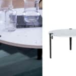 La Table basse Venezia est une pièce qui donne une nouvelle vie au plastique : le plateau est fabriqué à partir de centaines de pots de yaourt recyclés, sans additif liant, pressé en masse, ce qui rend chaque exemplaire unique. Le plateau blanc, parsemé d’éclats colorés issus d’étiquettes, évoque une esthétique “terrazzo” subtile et élégante.